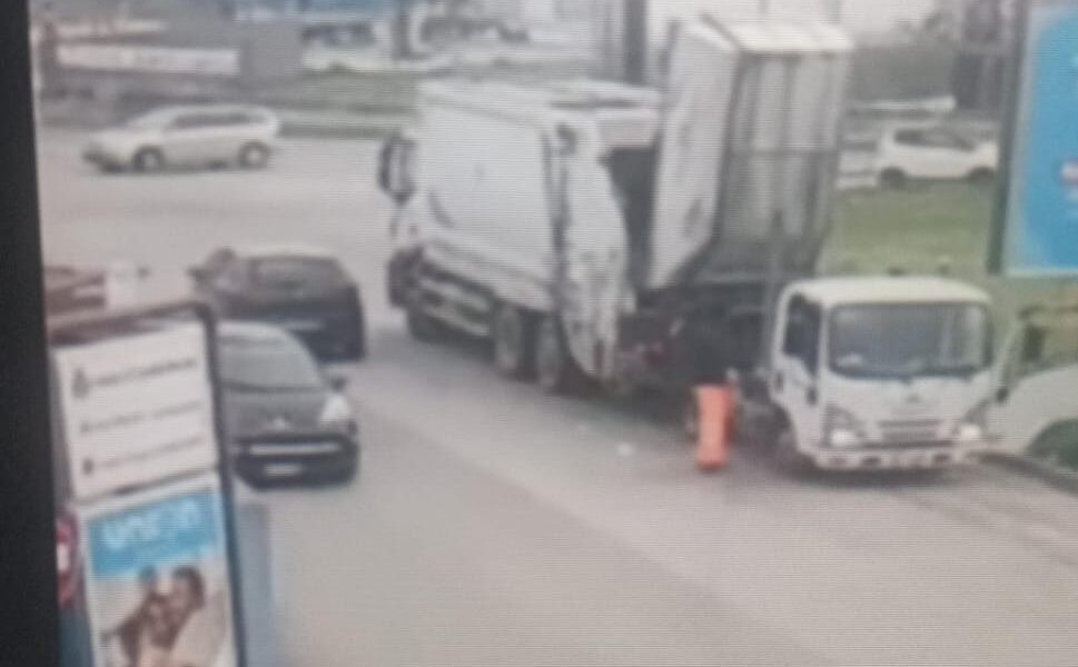 06/03/2026 Due camion della raccolta rifiuti di Trentola Ducenta fanno trasbordo in strada a Lusciano.